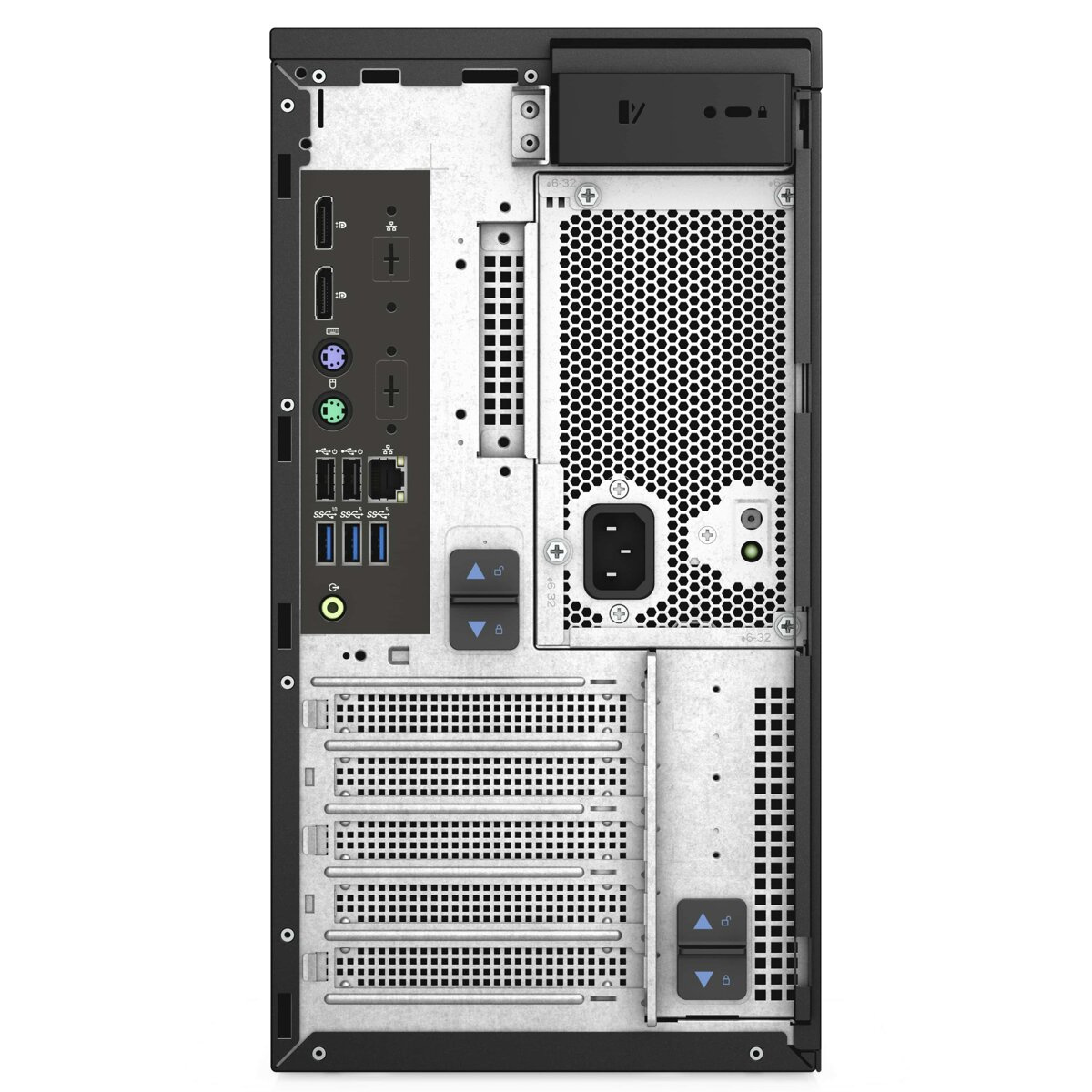 Niezwykle ważnym elementem Della Precision 3650 są także jego złącza. Na panelu przednim dostępne są dwa porty USB 3.1, pierwszej i drugiej generacji, a także USB typu C. Znalazło się miejsce również na port audio oraz czytnik kart pamięci. Na panelu tylnym znajdują się kolejne dwa USB 3.1 pierwszej generacji, oraz jedno USB 3.1 drugiej Generacji, a także dwa porty USB 2.0. Obecne jest także kolejne złącze audio, a także dwa DisplayPorty, RJ-45 (LAN) i dwa złącza PS/2.