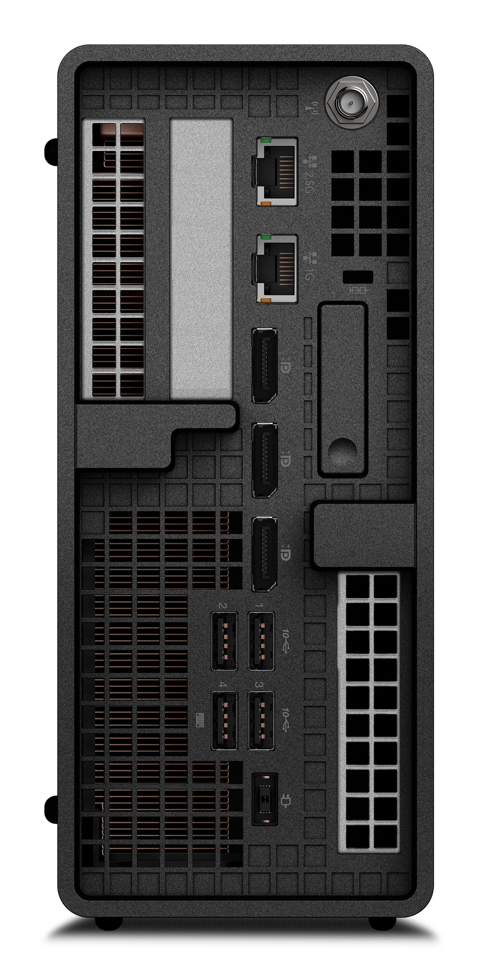 Ten model cechuje się konstrukcją SFF (Small Form Factor) – to wydajna stacja robocza w kompaktowej obudowie, oszczędzającej miejsce na biurku, idealna do biur i stanowisk sprzedażowych. Nie brakuje też złączy: liczne porty USB‑A 3.2 Gen 2, Thunderbolt 4, złącza audio czy porty sieciowe (w tym 2,5 Gb Ethernet), co pozwala na łatwe podłączanie urządzeń, monitorów i sieci firmowych.